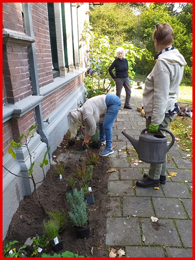 Vrijdag 10 oktober is het tuin team hier weer vol enthousiasme mee aan de slag gegaan, met als resultaat een prachtige tuin met stijl en karakter langs de voorgevel van het pand. Qigong-ers Heleen en Els, de initiatiefnemers hiervan, hadden het perfect voorbereid en georganiseerd en hebben met hulp van Margot en Margriet alle planten in de grond gezet, bemest en bewaterd.